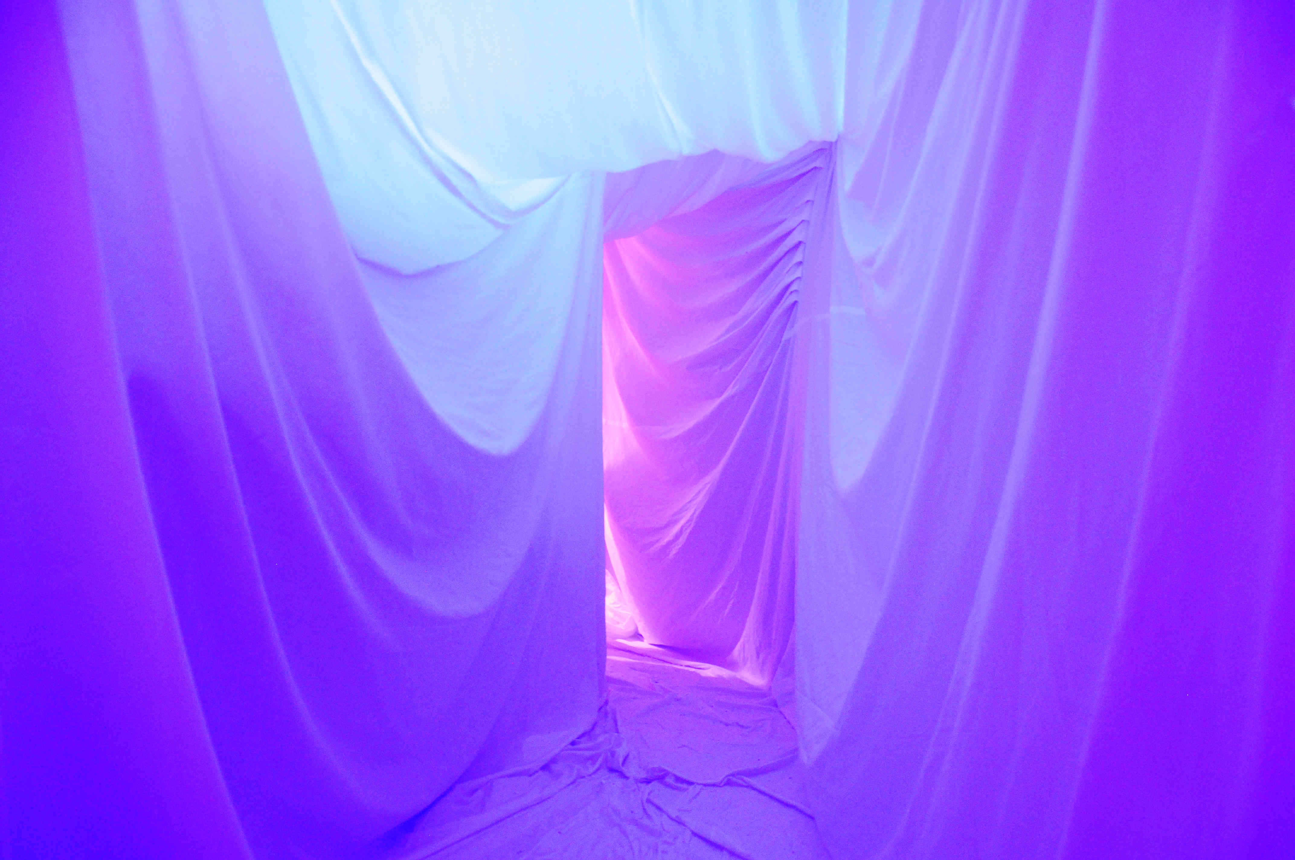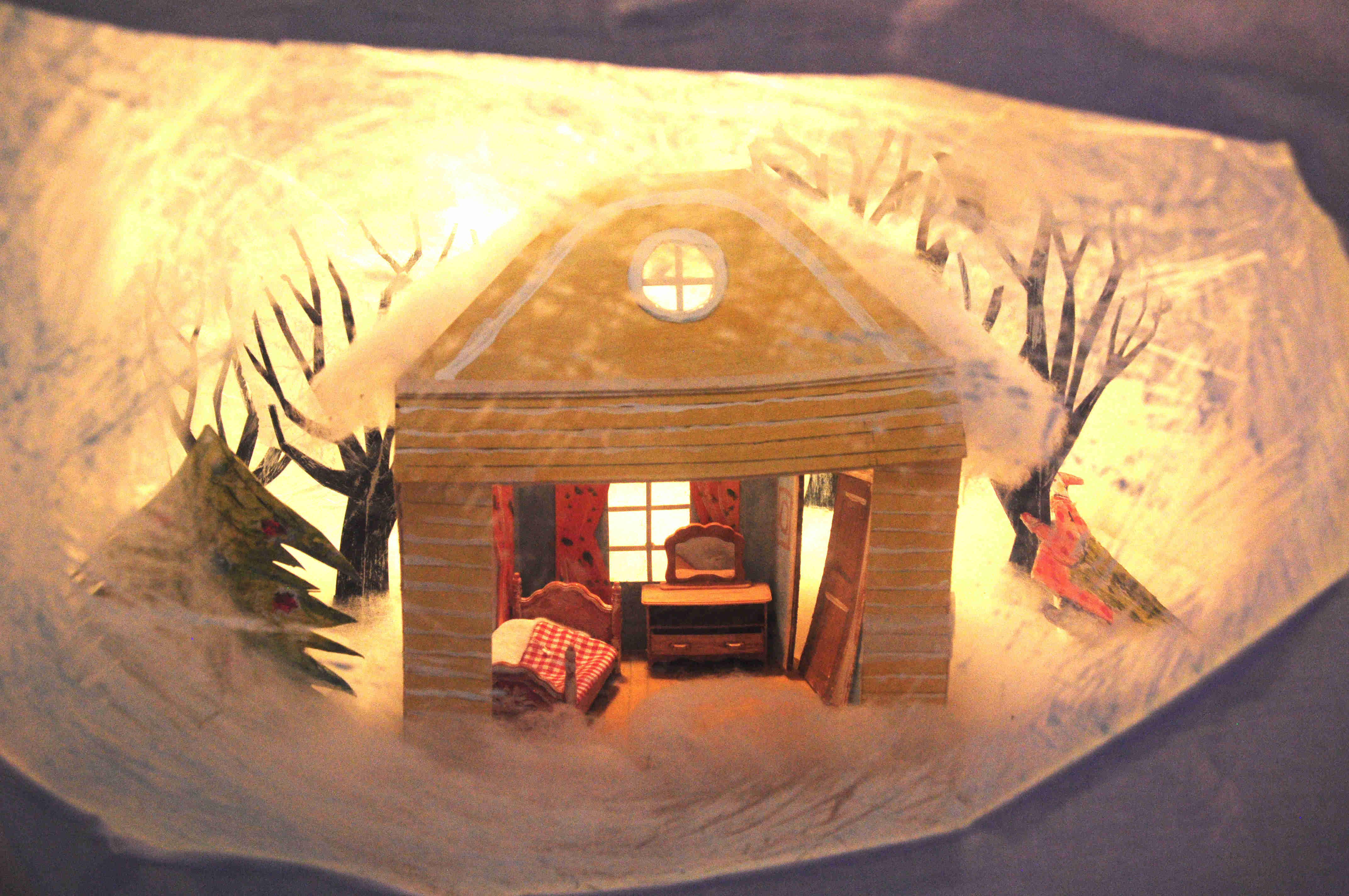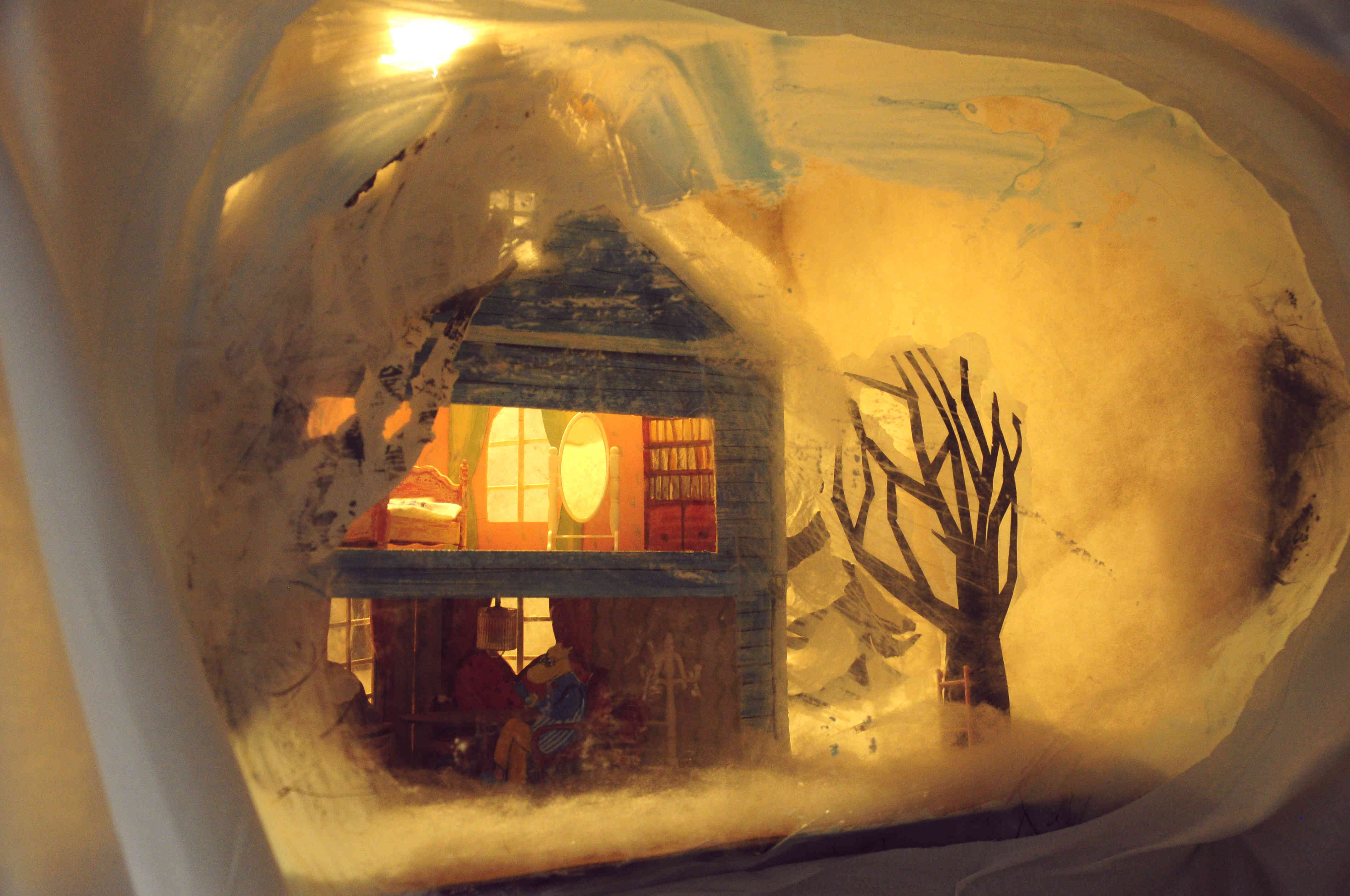 Двигаясь по тоннелю, зрители постепенно приближаются к «заснеженной поляне», где стоит домик муми-троллей, спящих крепким зимним сном.